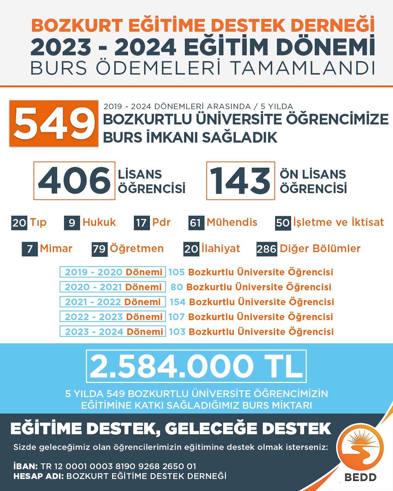 Eğitime destek, geleceğe destek diyerek Belediye Başkanımız Sayın Muammer Yanık’ın talimatlarıyla 2019’da kurduğumuz derneğimiz ile 5 yılda toplam 549 Bozkurtlu üniversite öğrencimizin eğitimine 2.584.000 TL katkı sağladık.